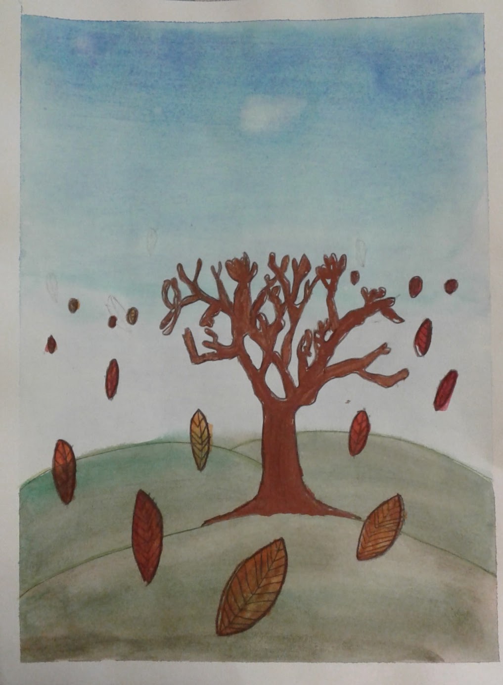 They added in falling leaves of a variety of sizes and painted them using watercolours.