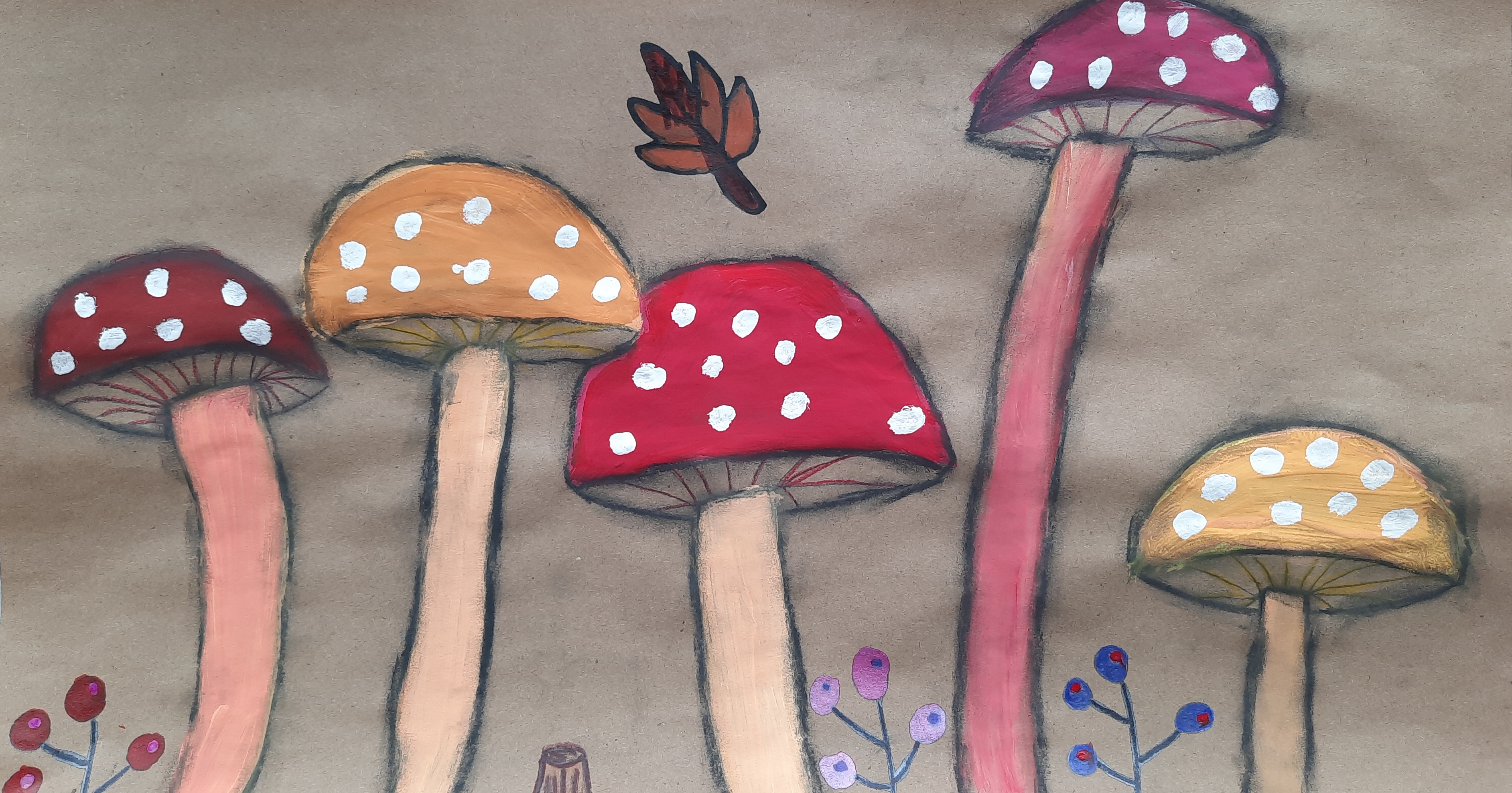 Then, mixing a variety of warm, autumnal colours, students painted the mushroom caps.