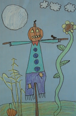 Here are some adorable scarecrow illustrations made by my Grade 2's. The goal was to have them add as many details as possible- to show them that details add interest to a work of art. We want the picture to tell a story and we want the viewer to spend time looking at their artwork.