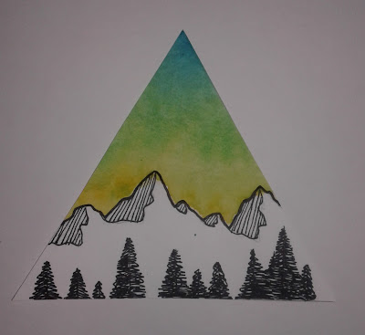 Jen's Instagram has videos of her painting and drawing process so I showed these to my Grade 4 - 6 class for inspiration. I pre-traced large circles onto heavy white paper. Students started by sketching out their mountains and shading them using hatching lines. They outlined this using ultra fine tip Sharpies. Then they drew evergreen trees along the bottom. Once everything was outlined, they painted the sky using watercolours.