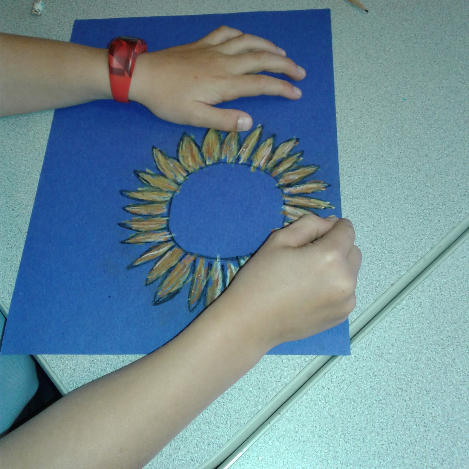 They tape their drawing onto to the construction paper and trace firmly over all the pencil lines with a blue ball point pen. This will transfer their drawing onto the construction paper.