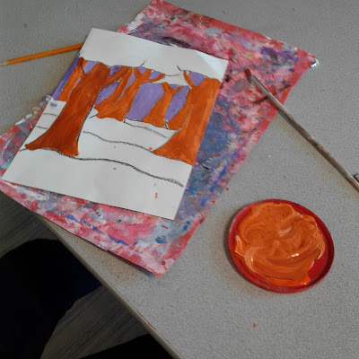 Then, using tempera, students painted the sky, then the tree trunk and finally the green parts.