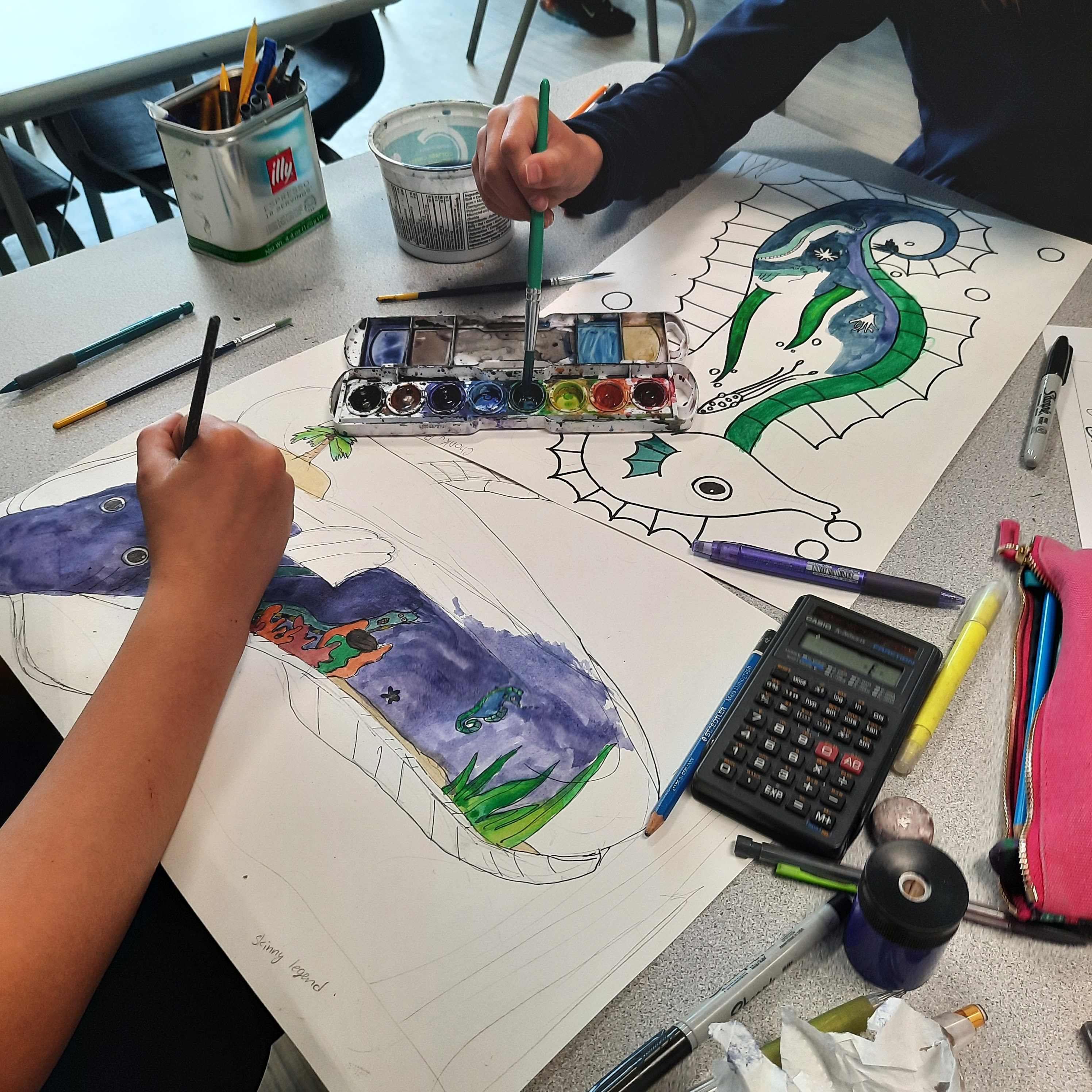 Students start with painting or sponging on their main basecoat colour. They use acrylics for this. Then they can sketch on the other details and continue painting in layers. At the end, some students add on additional details using a Sharpie.